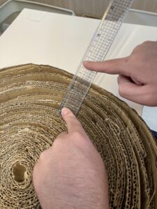 最初に段ボールを用意します。定規で5㎝測ってボールペンで定規に沿って真っ直ぐ線を引いて